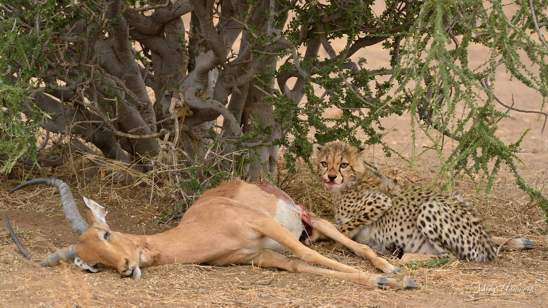 Young Cheetah feeding on an Impala carcass in Mashatu